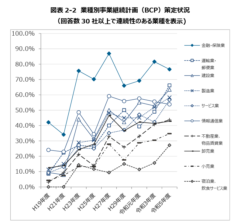 内閣府の調査(令和5年度企業の事業継続及び防災の取組に関する実態調査)では、建設業のBCP策定率は63.4%と、全業種の中でも比較的高い水準にあります。平成19年度時点では9.4%と低かった策定率は、現在では「金融・保険業」、「運輸・郵便行」に次ぐ策定率となり、事業継続への意識の高まりを感じます。