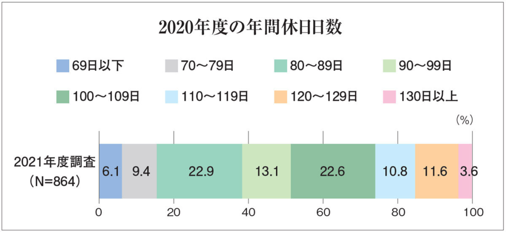 年間休日は約98.9日という報告もあり、実際の休みはさらに少ない傾向があります。