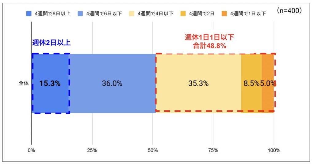 民間企業のアンケート調査によると、完全週休2日(4週8休以上)を取れているのは全体の15%ほどにとどまっています。